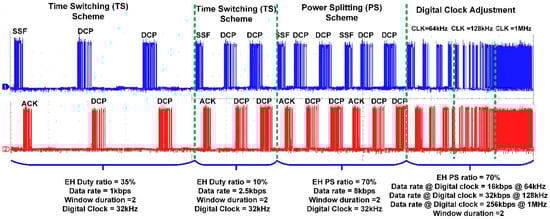 Initially, the PS ratio is selected for maximum energy harvesting for the SWIPT receiver. If data communication performs adequately and the available energy is sufficient then the PS ratio for energy harvesting is decreased to increase the data communication performance. The SWIPT transmitter selects the digital clock adjustment mode if it reaches the minimum PS ratio for energy harvesting. However, if the energy harvesting condition is not sufficient, then the SWIPT transmitter switches back to the TS scheme after reaching the maximum PS ratio for energy harvesting. Figure 9 shows the operations of SWIPT transmitter during the digital clock adjustment at the SWIPT receiver. If the ambient energy is sufficient, then the SWIPT transmitter will increase the digital clock of the SRC. This will increase data communication performance and higher data rates are possible. If the ambient RF energy is not sufficient, then the SWIPT transmitter switches back to the PS scheme to maintain the operation of the adaptive and optimized SWIPT.