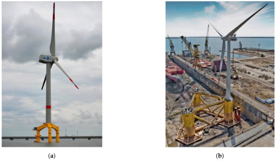 Offshore wind turbines. (a) Wind turbine over a fixed foundation [14]. (b) Floating offshore wind turbine assembly [15].