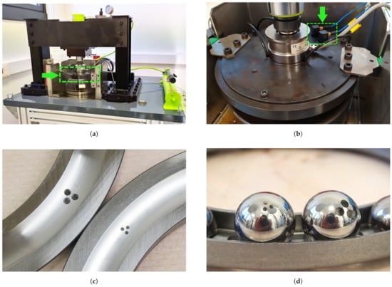 Test rig for low-speed bearings: (a) General view of the test rig [74]. The position of the upper support disc is highlighted with a green arrow. (b) Detail of the surface of the upper support disc. The position of the sensor is highlighted with a green arrow. (c) Damage seeded on shaft washers. (d) Damage seeded on ball bearings.