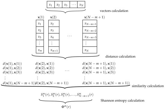 The approximate entropy (AppEn) was proposed by Pincus [97] as a family of formulas and statistics oriented to classify complex systems. After demonstrating its capabilities for time signal analysis [98], it was used for physiological signal processing [45,46,99,100]. To date, it has been used in several fields such as climate forecasts [101,102], finance [103], image encryption authentication [89,104], and fault diagnosis [105,106]. The approximate entropy (AppEn) basically quantifies the regularity and unpredictability of the analyzed signal by comparing sliding vectors from the original signal. The steps followed for the calculation of AppEn is shown in Figure 3.