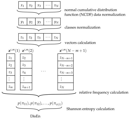 The last step is the use of the definition of the Shannon entropy with the frequencies calculated to obtain DisEn, where only the patterns have been considered [95]: