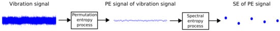 The quantification of information related to an event from a system is the main basis for using entropy-based indicators (EIs) for the analysis of time signals in general and vibration signals, particularly for this work, as EIs attempts to measure the uncertainty or irregularity of the analyzed signal [96]. For this study, four EIs are used to extract information about the state of the bearing from the dataset described in Section 2: Approximate entropy, dispersion entropy, singular value decomposition entropy, and spectral entropy of the permutation entropy. To explain EIs, the general approach will be followed by a numerical example. For simplicity, the following sequence x is used in this section to provide a numerical example: