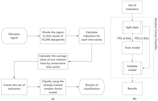 Although multiple articles use one entropy indicator for fault diagnosis, according to the published literature, the use of several entropy-based indicators for the classification of low-speed bearings is not capable of achieving damage localization. Consequently, the contribution of this study is the research on the feasibility of a set of entropy-based indicators for the classification and diagnosis of low-speed bearings with no previous signal decomposition or filtering. An advantage to highlight in the present work is the absence of signal preprocessing before the calculation of the indicators. From this perspective, a limited number of articles can claim this advantage, such as the work from Glowacz et al. [65], where the calculation of indicators based on the differences between frequency spectra of the vibration signals from different damage scenarios is proposed. From the use of several entropy-based indicators, the information extracted is compared to a set of classical indicators. To analyze how entropy-based and CIs can complement each other, the combination of both types of indicators is studied. As the RF classifier provides excellent performance in pattern recognition [66,67,68,69,70], this study attempts to utilize the RF classifier to construct a classification model for fault recognition of low-speed bearings.