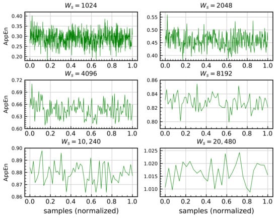 The AppEn evaluates the regularity of the signal, with the regularity defined as the tendency for the signal to have recurrent patterns throughout the signal [108]. Using this idea, the values of AppEn would be lower for regular signals and higher for complex signals. For example, a periodic vibration signal would have a low AppEn value (close to zero) because of the regularity (or periodicity) of the signal. In contrast, owing to its lower regulariy, a complex vibration signal with multiple frequency components will have a higher AppEn value compared to a periodic vibration signal.