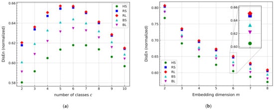 The calculation of DisEn starts with the parameters c and m, where is the number of classes and is the embedding dimension. First, the values of the analyzed signal are normalized using a normal cumulative distribution function (NCDF) to later create several embedding vectors and obtain dispersion pattern indicators. Finally, based on the Shannon entropy definition (Equation (34)), the DisEn value is obtained.