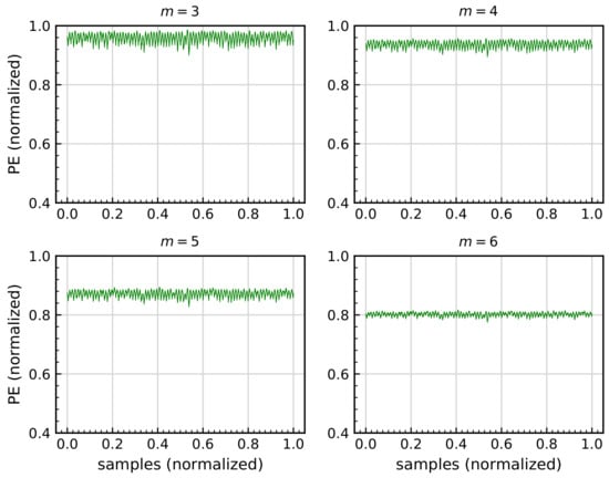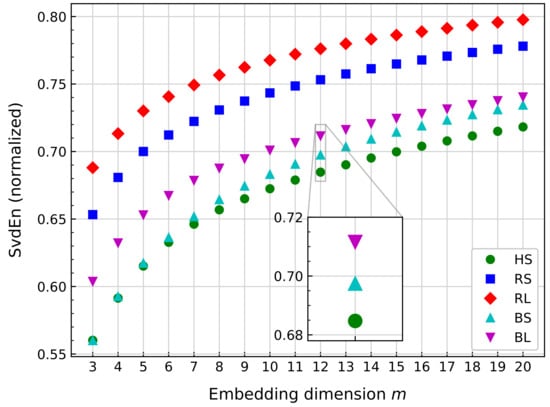 The idea behind SvdEn is to indicate the number of eigenvectors needed for an adequate explanation of the analyzed signal, giving an idea of its dimensionality and complexity. Therefore, the only parameter involved in the SvdEn calculation is the embedding dimension m. To understand the procedure, the numerical calculation of SvdEn is presented with the sequence x defined in Equation (18).