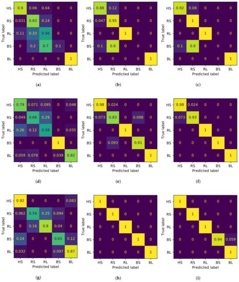 In summary, the data set included time signals for different speeds (5, 8, and 10 rpm) in each of the five scenarios, which are denoted as follows: healthy scenario (HS), small raceway shaft washer damage scenario (RS), large raceway shaft washer damage scenario (RL), small ball bearing damage scenario (BS), and ball bearing damage scenario (BL).