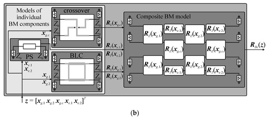 The Butler matrix models used here are defined as follows. Let RBe(y) and RBc(z) denote the high-fidelity EM model of the assembled BM (i.e., the one where all BM subcomponents are implemented and physically interconnected in the form of a single full-wave EM design) and the composite representation of the structure, respectively. The variables y and z represent their design parameters. The composite model responses are obtained using transmission-line theory from the S-parameter characteristics of individual BM subcircuits [43,44]. A conceptual illustration of the RBe and RBc models is shown in Figure 2. It should be noted that evaluation of the RBc model is to be preceded by simulations of its subcomponents (cf. Figure 2b). Nonetheless, the composite model is characterized by much lower evaluation cost compared to RBe. The vector z can be set equal to y but can also represent a composition of electrical and/or geometry variables of the sub-circuits selected for optimization (cf. Figure 2b). Example responses obtained from evaluation of RBe and RBc models for the z = y are shown in Figure 3. Despite reduced accuracy w.r.t. RBe (especially phase-wise), resulting from neglecting the coupling between adjacent components and loss at their interconnection, the composite model is useful for narrowing the search space to the region of interest before the fine-tuning stage.