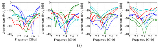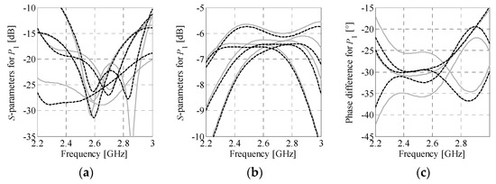 The design of individual BM components is realized as a sequential process that involves determination of BLCs and crossovers geometries, as well as by tuning of the phase shifters. For the given center frequency f0, the crossover—see Figure 5a for illustration—can be considered as a “static” component of the matrix. In other words, its dimensions do not change when the BM is redesigned for another set of output phase differences. Consequently, the same design can be used to realize a range of Δθj. The crossover dimensions are adjusted in two steps. First, the selected geometry is optimized for minimization of U2.1 = max(|S11|, |S33|) at the center frequency f0, where |S11|, |S33| represent reflection of the crossed TLs. Next, the design is oriented toward ensuring that electrical lengths of the crossed transmission lines βc.1 and βc.2 are equal at f0. This is achieved by minimization of the objective function U2.2 = (βc.1 − βc.2)2. In each design step, the optimization is carried out using the algorithm of Section 2.4.1 and the RE(xg.c) model responses. Here, the vector xg.c represents geometry parameters of the crossover. The final design xg.c* structure provides equal length lines (βc = βc.1 ≈ βc.2) with low reflection and high isolation levels (note that the term isolation refers to attenuation of the signal and is expressed as an absolute value of the transmission—in dB—between the selected pair of ports), all important for high BM performance.
