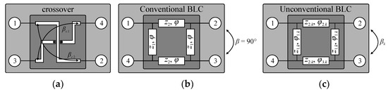 The illustration of the BLC structure capable of obtaining the desired phase and its comparison with conventional 90° hybrid is shown in Figure 5b,c. Given the phase difference βk (k = 1,2), kth coupler consists of a pair of 90° TL sections with characteristic impedance z1.k and equal electrical length of φ1.k, as well as a pair of TLs with impedance z2.k and electrical lengths φ2.k and φ3.k, respectively. Electrical parameters of the circuit can be obtained from the following equations [48]: