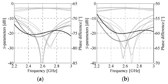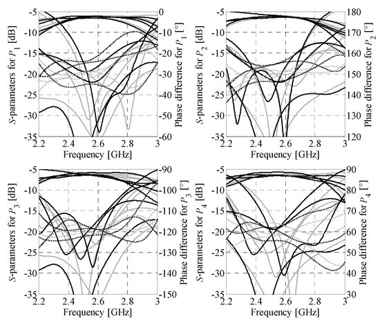The first design example is a Butler matrix featuring an output-port phase shifts of Δθ1–4 = {−30°, 150°, −120°, 60°}. The electrical parameters of the structure components (cf. Section 3.1), i.e., β1 = −75°, β2 = −60°, and β3 = −45°, have been synthesized from (4)–(6).