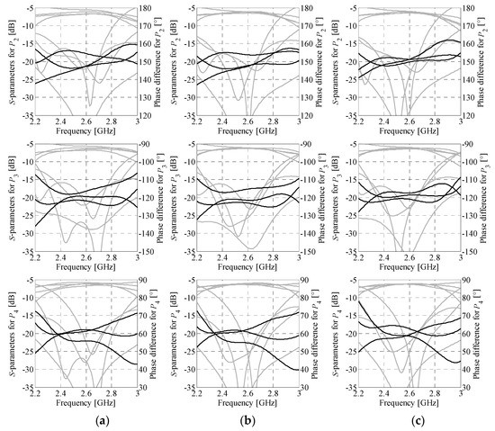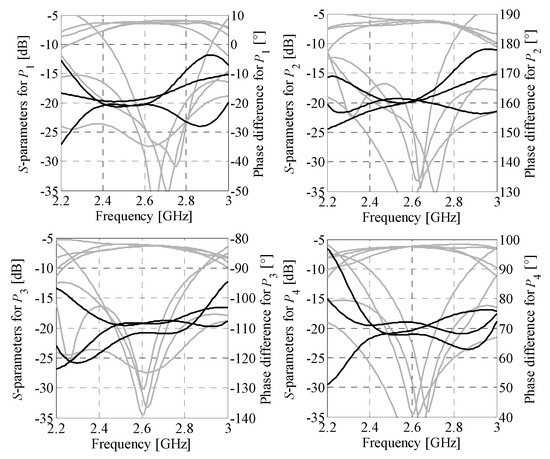Simulation-based validation of the optimization results has been performed through evaluation of the optimized designs using a solver based on the method of moments (Keysight ADS). A comparison of the performance characteristics obtained using CST Studio and Keysight ADS is shown in Figure 12 and Figure 13, respectively. The simulation results for BMs feature reflection below −12 dB and isolation above 13 dB within the bandwidth of interest. Regardless of the selected excitation port, the first design offers the insertion-loss imbalance below 0.9 dB and phase shift error below 8°. For the second matrix, the values are 1.5 dB and 9°, respectively. The obtained results indicate that the EM simulation results are valid.