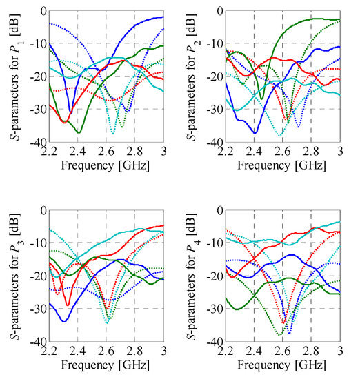 The second design example is the Butler matrix structure featuring phase shifts Δθ1–4 = {−20°, 160°, −110°, 70°}. The electrical properties of the matrix components required to obtain desired Δθj values are β1 = −65°, β2 = −40°, and β3 = −45° (cf. Section 3.1). The BM topology is shown in Figure 9b. The crossover dimensions remain the same as for the one used in Section 4.1. The initial dimensions of both BLCs xg.1(0) = [0.41 0.59 0.3 0.3 2.31 2.48 1.39]T and xg.2(0) = [0.59 0.72 0.3 0.3 1.5 2.79 0.54]T have been determined as described in Section 3.2 and Section 4.1 The optimized dimensions xg.1* = [0.37 0.53 0.36 0.26 3.06 2.89 1.6]T and xg.2* = [0.57 0.67 0.33 0.34 1.48 2.95 0.58]T have been obtained after seven and nine iterations of (2), respectively.