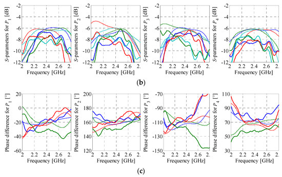 Measurements (––) vs. simulations (···) obtained using the EM model that account for the systematic errors: (a) reflection/isolation, (b) transmission, and (c) output-port phase differences.