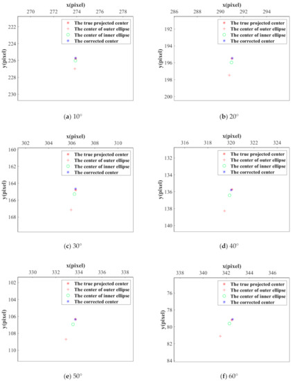 To verify the accuracy and reliability of the proposed positioning algorithm, we have conducted certain simulation experiments under different viewing angles, image resolutions, and image noises. The results indicate that the eccentricity errors of the larger and smaller circles at a large viewing angle of 70° are reduced by 95% and 77% after correction using the proposed method. The front-view image resolution has little or no impact on the locating algorithm. When the image noise is increased, negligible change occurs in the eccentricity errors of outer and inner ellipse centers obtained by fitting, as well as the CCCT corrected center; however, the eccentricity error of the outer ellipse center is five times larger than that of the inner ellipse center, and twenty times that of the corrected center.