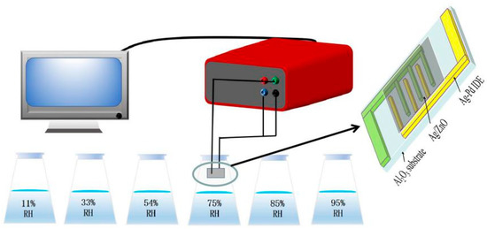 During the measurement of humidity characteristics, different humidity environments were controlled by saturated salt solutions of LiCl, MgCl2, Mg(NO3)2, NaCl, KCl and KNO3, corresponding to relative humidity of 11%, 33%, 54%, 75%, 85% and 95% [19]. In conventional humidity measurement, humidity usually refers to relative humidity, which is a generally accepted method of measuring humidity, and so in this article, relative humidity is used for measurement. Sprayed ZnO, Ag/ZnO and water was mixed on the Ag-Pd interdigital electrode (IDE) and then put it in a 60 °C constant temperature oven to dry for 1 h to form a humidity sensor. Throughout the measurement processes, the test voltage was set to be AC 1V, measurement frequency was 40 Hz to 100 kHz, and the whole test process was carried out at room temperature (25 °C). The test details of the humidity sensor are shown in Figure 1.