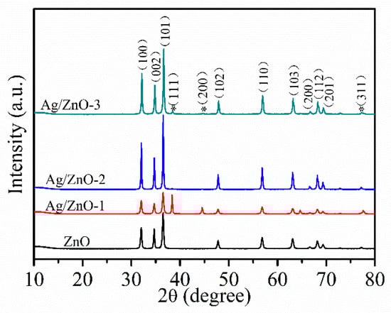 XRD spectra of ZnO, Ag/ZnO-1, Ag/ZnO-2 and Ag/ZnO-3.