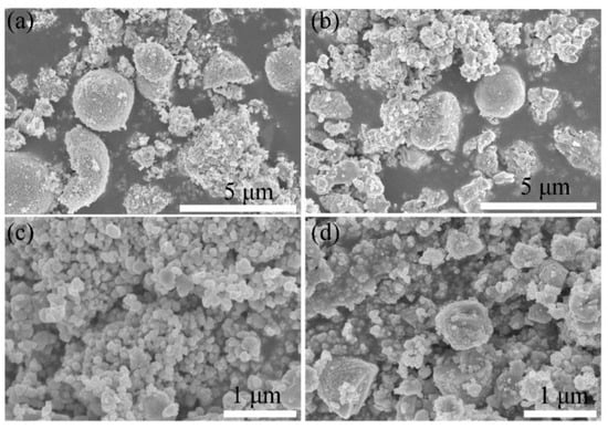 Figure 3 shows the scanning electron microscope images of ZnO and Ag/ZnO. In Figure 3a,b, ZnO and Ag/ZnO-1 exhibit irregular microparticles with a diameter of about 50–70 nm and 130–160 nm, and these irregular microparticles are agglomerated. Ag/ZnO-2 are irregular microparticles with a diameter of about 70–90 nm, and the particles are evenly distributed and dispersed without agglomeration (Figure 3c). The structure of Ag/ZnO-2 is evenly distributed and more dispersed. Compared with the other three structures, it can provide more adsorption sites for water molecules, making more water molecules adsorb to the surface of the material. This structure plays a vital role in the humidity sensor. In Figure 3d, Ag/ZnO-3 is also of irregular particles with a diameter of about 60–70 nm, and the particles are slightly agglomerated. In general, compared with the other three structures, Ag/ZnO-2 may show better humidity sensing performance.