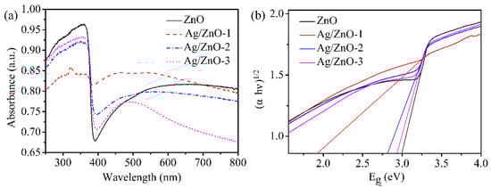 (a) UV-vis absorption spectrum and (b) Eg of ZnO, Ag/ZnO-1, Ag/ZnO-2 and Ag/ZnO-3.