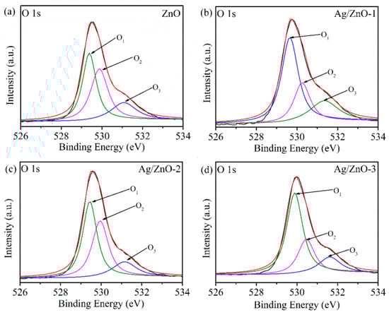 In order to further determine the state of oxygen on the material surface, the O 1s peak XPS spectra of ZnO and Ag/ZnO are fitted in Figure 5. The O 1s of all samples are fitted to three peaks, namely O1, O2 and O3. The O1 peak at 529.3 eV is the O2− bonded to Zn2+, the O2 peak at 530.2 eV is the defect oxygen on the zinc oxide surface, and the O3 peak at 531.2 eV is some adsorbed oxygen on the zinc oxide surface. After calculation, it was found that the defect oxygen area ratios of the four samples are 27.8%, 24.1%, 38.9% and 25.6%, respectively. It can be seen that the number of oxygen vacancies on the Ag/ZnO-2 surface is the largest. It is well known that oxygen vacancies can accelerate the decomposition of water molecules into conductive ions [23,24]. For Ag/ZnO-2, recombination of Ag leads to the most oxygen vacancies to dissociate water molecules adsorbed on the surface of zinc oxide to form H3O+ conductive ions, hence improving humidity sensitivity.