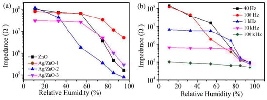 (a) Resistance changes of ZnO, Ag/ZnO-1, Ag/ZnO-2 and Ag/ZnO-3 at 11% RH-95% RH; (b) Ag/ZnO-2 humidity sensor responses at 40 Hz, 100 Hz, 1 kHz, 10 kHz and 100 kHz.