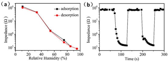 The hysteresis, response/recovery time, and repeatability of the humidity sensor are also the main factors that determine the performance of the sensor. Figure 7a shows the hysteresis test of Ag/ZnO-2 humidity sensor in the range of 11% RH to 95% RH. When the environmental RH changes from 11% to 95% RH, the process of the sensor continuously adsorbing water molecules is an adsorption process. Conversely, when the RH is changed from 95% to 11% RH, the process by which the sensor continuously separates from water molecules is a desorption process. It can be observed that the resistance value of adsorption process is almost higher than that of desorption process in whole detection range, which is mainly caused by the endothermic desorption process of water molecules on Ag/ZnO-2 surface is slower than the exothermic adsorption process. The hysteresis error can be calculated according to γH = ±ΔHmax/2FFS, where ΔHmax is the maximum hysteresis value and FFS is the full range output of the sensor [28]. It can be calculated that the maximum hysteresis error of the Ag/ZnO humidity sensor is 3%. Compared with previously reported ZnO humidity sensor, the Ag/ZnO-2 humidity sensor also has a low hysteresis error. Ag/ZnO-2 humidity sensor response/recovery time and repeatability test is shown in Figure 7b. It is well known that the time required for the sensor response or recovery process resistance to reach 90% is defined as response or recovery [29]. Response time and recovery time of Ag/ZnO-2 humidity sensor are 36 s and 6 s, respectively. The faster response and recovery speed of Ag/ZnO-2 is mainly due to the abundant oxygen vacancies on its surface, which causes a large number of water molecules to be decomposed quickly. In addition, the distribution of Ag/ZnO-2 is uniform, and the absence of agglomeration will also cause water molecules to quickly detach from the surface of the material. We have continuously tested the adsorption and analysis process of Ag/ZnO-2 humidity sensor in two cycles, and we can see that adsorption and desorption process of the sensor in the two cycles are almost the same, which shows that Ag/ZnO-2 humidity sensor has good repeatability. All the above properties show that Ag/ZnO-2 humidity sensor has the potential to develop a high-performance humidity sensor, and also provides a new idea for the preparation of a new humidity sensor.