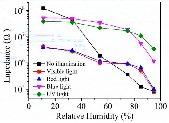 Figure 8 shows the resistance response curve under different lights. This section studies the effects of light with different wavelength on the resistance of Ag/ZnO-2 and judges the sensing characteristics of the humidity sensor from the situation of the resistance response curve, taking into account that the use of different illuminations can make the surface of the sample obtain a certain amount of energy, and that a small amount of photoelectrons may be generated on the surface of the sample, thereby increasing the conductivity of ZnO. In the experiments, visible (5 W), red (5 W, 546 nm), blue (5 W, 465 nm), and ultraviolet light (5 W, 365 nm) were used to illuminate Ag/ZnO-2 sensors at different relative humidity. We found that in the absence of light, the sensors showed the best response and the best linearity, reflecting that the light affects the performance of the Ag/ZnO-2 humidity sensor, and in the absence of lighting, the synthesis cost of the sensor can undoubtedly be reduced.