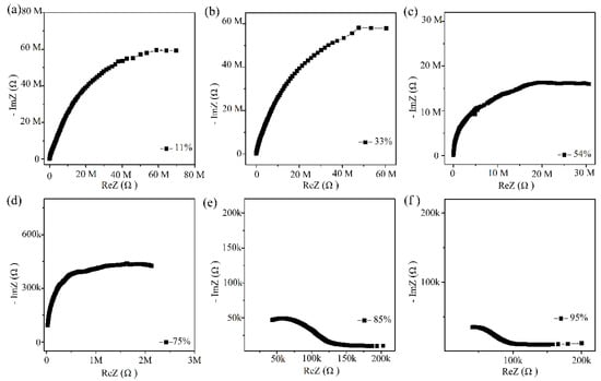 (a–f) Complex impedance spectroscopy of Ag/ZnO-2 humidity sensor from 11% RH to 95% RH (k refers to 103 and M refers to 106).