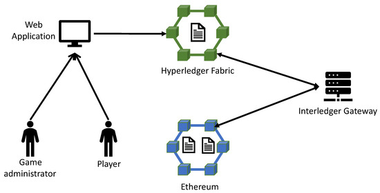 Scenario 2—Two types of blockchains, public and private Ethereum: The second scenario investigates the gains from utilizing two types of blockchains, a public blockchain, and a private/permissioned blockchain. The public blockchain is the Rinkeby Ethereum test network, while the permissioned blockchain is a private instance of Ethereum. The game smart contract is deployed on the private ledger, while the other two smart contracts are deployed on the public ledger. In order for the two ledgers to communicate with each other, there is an ILG, which is responsible for the interconnection of them. ILG “listens” for events on both instances of Ethereum and handles the corresponding functions.