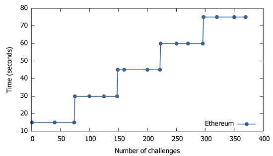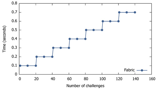 Finally, the last KPI refers to time scalability, which is shown in Figure 4 for the public Ethereum, and in Figure 5 for Hyperledger Fabric, respectively. As for cost scalability, we defined time scalability as the ratio of time over the number of challenges. From the figures, we observe that the time scalability for all types of blockchain is a stepwise function, which macroscopically becomes linear. Again, the time scalability is similar for points, tokens, etc.