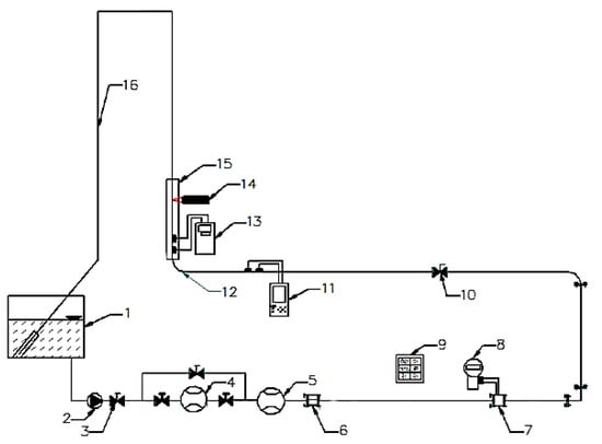 Experimental stand. 1—container with water; 2—pump; 3—control valve; 4—coupled water meter; 5—electromagnetic flow meter; 6—stream straightener; 7—ISA orifice with annular chamber pressure tapping; 8—pressure transducer; 9—programmable current recorder; 10—throttle; 11—reference ultrasonic flow meter measuring in an undisturbed area; 12—90° bend with radius R = 2D; 13—ultrasonic flow meter measuring in an area of disturbed flow; 14—LDA laser Doppler anemometer; 15—correction vessel; 16—return recirculator pipeline. Description in the text.