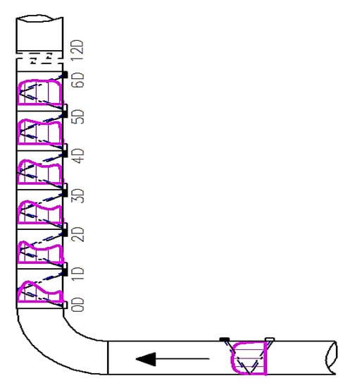 The initial angle marked as 0° is the inflow angle to the bend. This angle is on the axis of the pipeline and is also the symmetry plane of the element disturbing the flow. The projections in Figure 7 and Figure 8 accurately show the distribution of velocity contours in the cross section immediately behind the 90° bend. This distance is defined as 0D, which defines the distance between the measurement plane and the disturbing element expressed in nominal pipeline diameters.