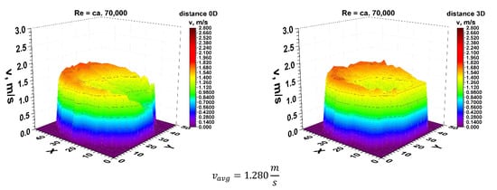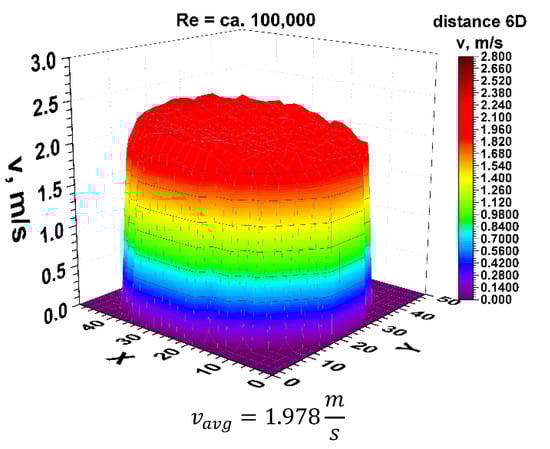 For technical reasons, the measurement with the laser anemometer was performed only for the X component of the velocity of the measured medium, which is the equivalent of measuring with a Prandtl tube. After calculating the integrals of the surfaces obtained as a result of measurements of the 3D velocity distribution obtained by laser anemometry, the results were obtained vavg = 1.843 m/s for the flow where Re ≅ 100,000 and vavg = 1.280 m/s for the flow where Re ≅ 70,000.