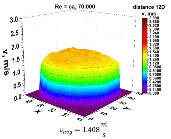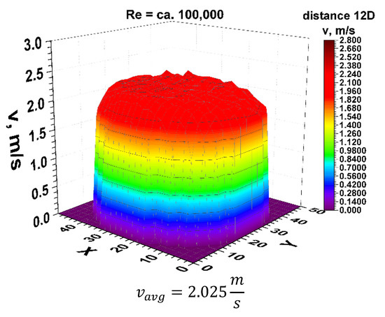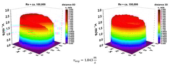 Finally, the focus should be on the distance of 12 nominal pipeline diameters from the disturbance. Figure 21 and Figure 22 show the 3D velocity distribution for two different volume streams, expressed with Reynolds criterion numbers. In a plane separated by twelve nominal pipeline diameters, represented by the marking 12D, they have a characteristic 3D velocity distribution. 3D velocity distribution for both streams clearly shows that the velocity profile has stabilized [,] The above graphs show that the velocity profiles are flat in the central part of the 3D distribution, which indicates that the flow velocity profile is stabilized.