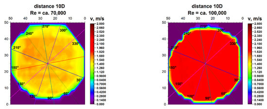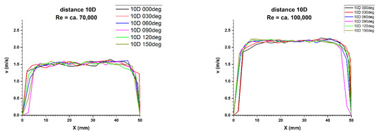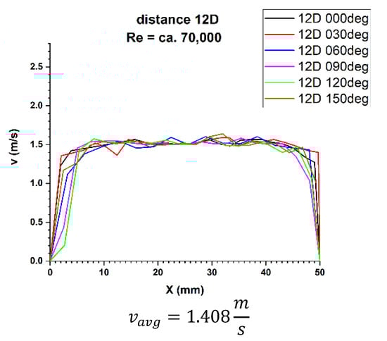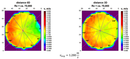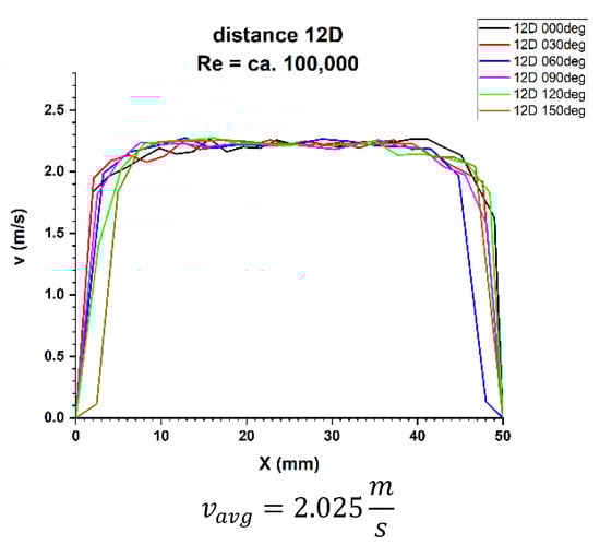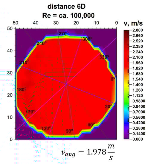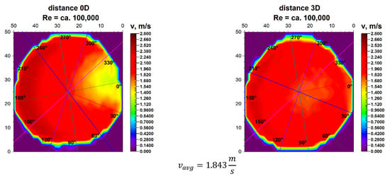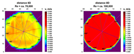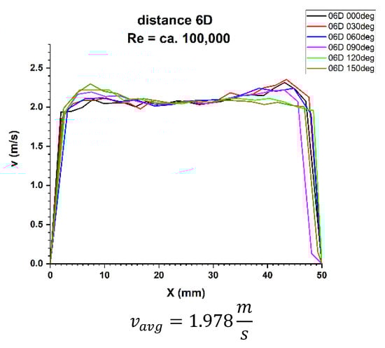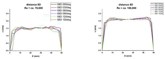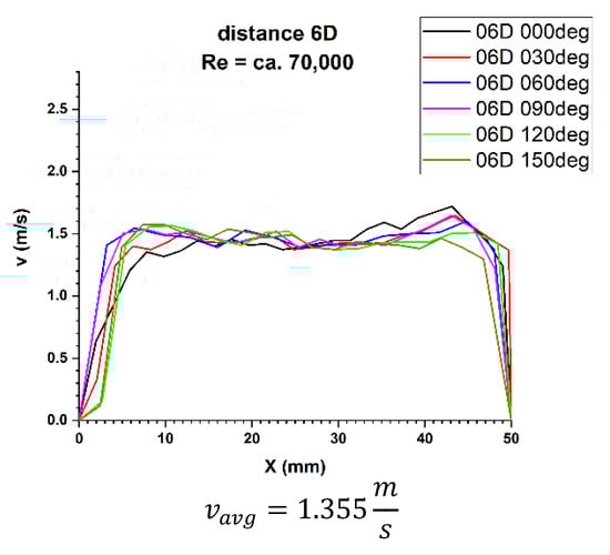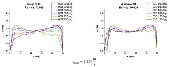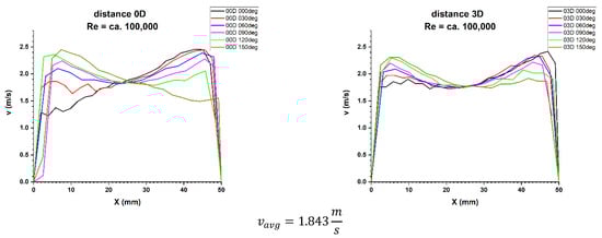 The stabilization of the 3D velocity distribution is noticeable. The obtained results for various Reynolds numbers, shown in Figure 11 and Figure 12, were projected onto the plane, which is shown in Figure 13 and Figure 14, where, analogously to the distance 0D, cross-sections in accordance with the mounting angles of the ultrasonic heads were made. The above graphs show that the velocity profiles begin to become flat in the central part of the 3D velocity distribution, which indicates the stabilization phase of the flow.