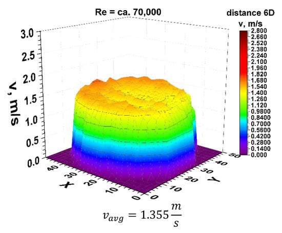 After calculating the integrals from the surfaces obtained as a result of measurements of 3D velocity distribution obtained by laser anemometry, the results were obtained as an average velocity module vavg = 1.978 m/s for the flow, where Re ≅ 100,000 and vavg = 1.355 m/s for the flow, where Re≅70,000.