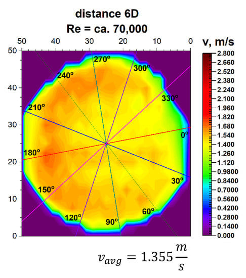 The velocity blocks obtained for the various Reynolds numbers, illustrated in Figure 5 and Figure 6, are projected onto the plane and shown in Figure 7 and Figure 8. The lines on the projection mark the angles for which flow measurements were carried out with the use of ultrasonic flow meters with heads placed on the pipeline.