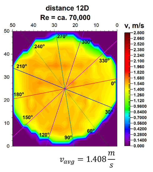 From the graphs in Figure 21 and Figure 22, reflecting the geometry of the velocity profile at a distance of 12D behind the 90° bend, it can be concluded that they are similar to each other. Stabilization of the 3D velocity distribution is noticeable. The obtained results for different Reynolds numbers, presented in Figure 11 and Figure 12, were projected onto the plane, which is shown in Figure 13 and Figure 14, and, similarly to the distances 0D and 6D, cross-sections were made in accordance with the mounting angles of the ultrasonic heads.