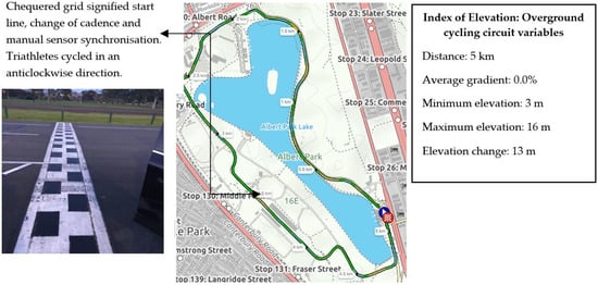 Map view and location of both experiments. The leftmost side represents the zoom view of chequered grid that signified a cadence change in both experiments. The rightmost side represents the index of elevation that contains the course variables experienced by the triathletes during both experiments. The average gradient across the 5 km circuit was 0%.