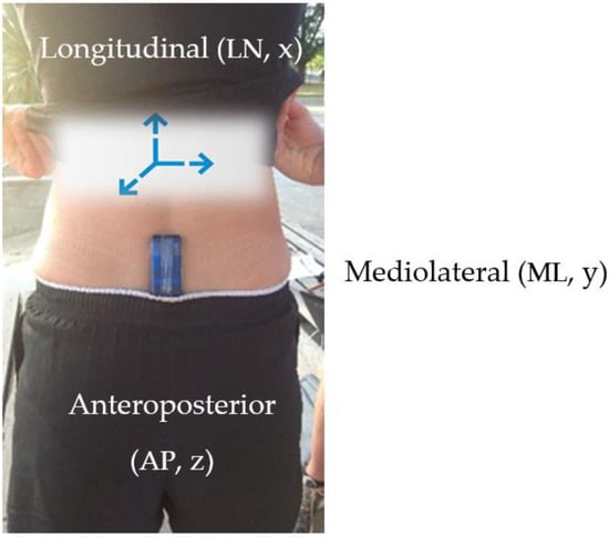During measurement, an inertial measurement unit (IMU), specifically a triaxial accelerometer (52 mm × 30 mm × 12 mm, mass 23 g; resolution 16-bit, full-scale range 16 g, sampling at 100 Hz: SABEL Labs, Darwin, Australia) was fixed to participants’ spinous process (L5/S1) using double sided elastic adhesive tape. Specifically, linear accelerations at the sensor were measured on the skin over spinous processes, defined as the lumbar vertebrae position 5 (L5) and sacrum vertebrae position 1 (S1). The basis for this location is that it is the unique and closed external point to trunk movements and the point of distribution of the weighted position vectors that sum to zero.
