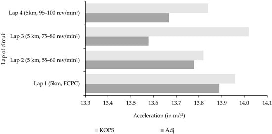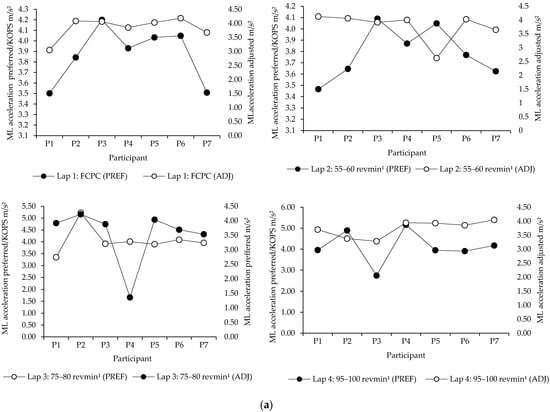 Given that the main effects detected by the sensor were found in mediolateral trunk acceleration, within participant post hoc analysis was undertaken to examine individual responses (Figure 6). The adjusted saddle position was found to reduce total trunk mediolateral acceleration in the majority of participants. However, post hoc evaluation revealed greater variability of acceleration magnitude between participations and their respective laps. Along this line, though the total yield of reduced mediolateral trunk acceleration in the adjusted saddle height resulted in an approximate and cumulative 25.1% difference, a relative measure of variation compared to the preferred/KOPS, individual outliers (i.e., physiological capability) could have influenced performance.