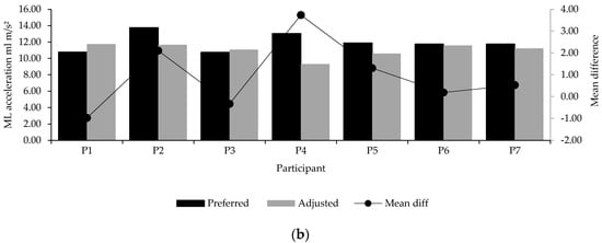 In accordance with Equation (1), adjusted saddle position was 84.4 ± 4.9 cm compared with 78 ± 0.4 cm preferred. When comparing the means of the total group (n = 7), a significant difference (p < 0.0001) was found in total acceleration magnitude between preferred and adjusted saddle position. There was also a significant difference found through RPE between both saddle positions (p < 0.0003) (Table 2).
