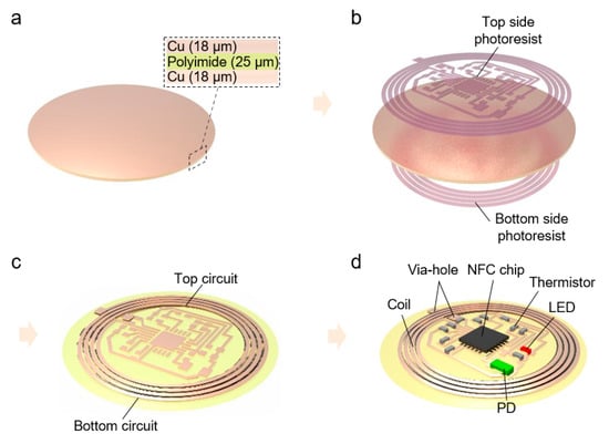 Figure 4 exhibits fabrication process of the device. A Cu (18 μm)/PI (25 μm)/Cu (18 μm) foil (SME, Korea) was used to fabricate dual-layered FPCB (Figure 4a). The photolithography process on each side of foil was performed with photoresist (PR, AZ9260, AZ Electronic Materials, Luxembourg) and developer (AZ 300 MIF, AZ Electronic Materials, Luxembourg) (Figure 4b). The double-side patterned sample is etched with Cu etchant (CE100, TRANSENE, Danvers, MA, USA) (Figure 3c). Finally, the electrical components were soldered on the fabricated FPCB with silver paste (BST-506, BEST, China) (Figure 4d). Moreover, drilling holes formed the via-holes using a micro drill bit, and the filled silver paste offers the electrical path between top and bottom coils. Therefore, the dual-layer device can be achieved through the overall process.