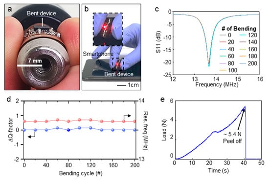 The frequency characteristics of device is measured with bending stress (Figure 5a–c). As shown in Figure 5a, the device has high flexibility with ~7 mm of Radius of Curvature (RoC), considering that the RoC of the finger is 13 mm which is the smallest RoC among typical measurement site [45,46,47]. Furthremore, the device can operate connected with smartphone even in bent state (Figure 5b). A cyclic bending test is performed to confirm the durability of the device against bending stress. For the test, the device was bent 200 times with a cylindrical object as displayed in Figure 5a. As exhibited in Figure 5c, the S11 data of the device maintain the almost same value during the repetitive bendings. In addition, as presented in Figure 5d, frequency features are verified in terms of Q-factor and resonance frequency (Res. Freq.) which are barely changed during the cyclic bending test. A biocompatible double-sided tape is used for adhesion with skin. Figure 5e exhibits the result of adhesion test of the device with skin using a peeling-off tester (text analyzer pulse, Micro stable, UK) on the device mounted on the skin. The measured adhesion strength is suitable for devices attaching to the skin compared with reported devices [28,48].