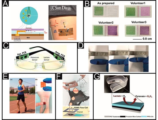 - Currano, L.J.; Sage, F.C.; Hagedon, M.; Hamilton, L.; Patrone, J.; Gerasopoulos, K. Wearable sensor system for detection of lactate in sweat. Sci. Rep. 2018, 8, 15890. [Google Scholar] [CrossRef] [PubMed]