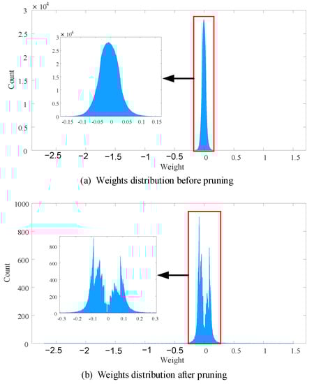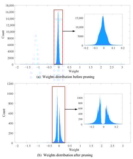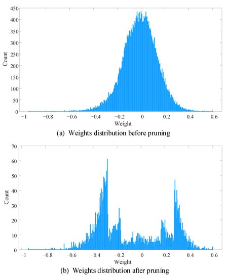 where W ^ denotes pruned connection weights, ⊙ indicates the Hadamard product operator. The pruning mask F can be constructed according to pruning strategy. For example, when we use threshold method to prune fully connection layers, the F can be calculated by
