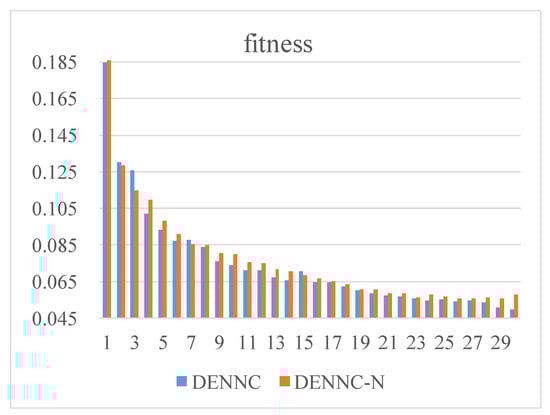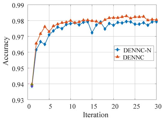 The computational complexity of DENNC model consists of two parts, the computational cost of DEPS for model pruning and the computational cost of fine-tuning pruned model. In DEPS, the main complexity comes from fitness evaluation. Assuming the number of weight parameters is P, the computational cost of fitness evaluation is O ( P ) for each individual. Therefore, for a population with N individuals, the computational cost is O ( N P ) . The total computational cost of DEPS is O ( N P G ) because of generation G. Assuming the computational cost of neural network training for each epoch is O ( T ) , the fine-tuning costs O ( e · T ) computations, e denotes the number of epoch in fine-tuning. Thence, the computational cost of DENNC in each cycle is O ( N P G + e · T ) . If K stands for total number of iteration, the computational complexity of our method is O ( K ( N P G + e · T ) ) .