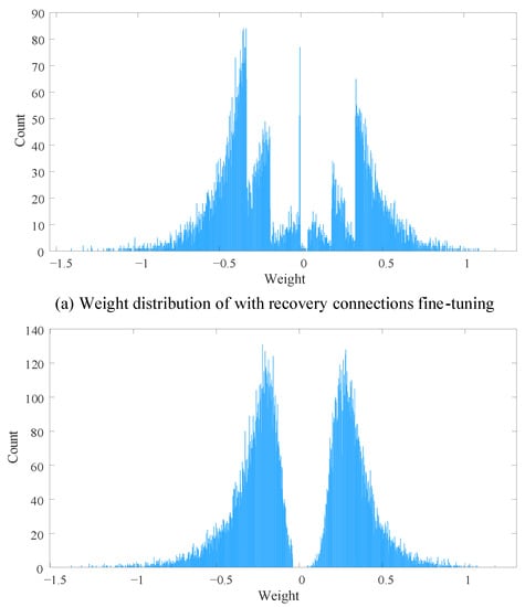 In the model fine-tuning stage, we not only update the remaining weights, but also recover a few pruned connections, which is known as the recovery connections fine-tuning strategy. Updating the remaining weights helps to improve the accuracy of the model, while restoring pruned connections can promote the capacity og the model. During fine-tuning, we randomly recover some previously pruned connections and set random weights to them firstly, and then train the pruned neural network for a few epochs as usual. The detailed fine-tuning parameters are the same as those of the model training, except that the epochs are few.