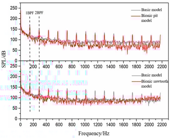 - The wide-band noise reduction ability of the sawtooth structure is not suitable for the high-frequency band. On the frequencies other than the BPF and its frequency doubling, the sawtooth structure almost loses its noise reduction ability from 1200 Hz. The sawtooth structure causes the noise to increase when the frequency exceeds 1600 Hz. The results of pressure fluctuation near the volute tongue also show that the sawtooth structure causes the amplitude of pressure fluctuation after 1600Hz to exceed the basic model.
