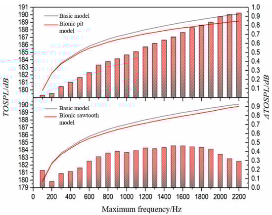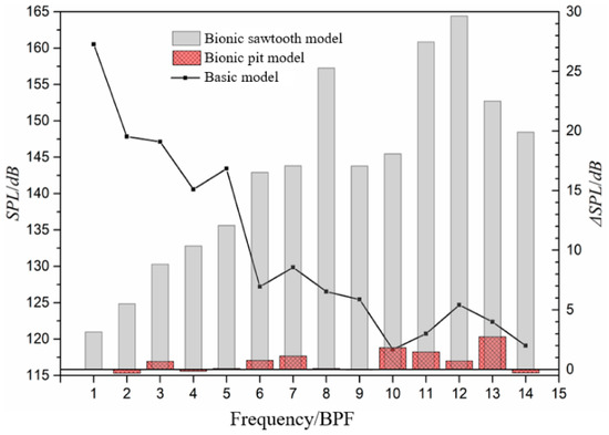 - The noise decrement effect of the pit structure is apparently different from that of the sawtooth structure. The noise reduction effect of the pit structure is aimed at the wide-band noise, and the sawtooth structure is aimed at the discrete noise at the BPF and its frequency doubling. The highest noise reduction value of the sawtooth structure is noted to be about 30 dB at 12 BPF. The change of discrete noise has a significant effect on the total sound pressure level. When the total sound pressure level is taken as the index, the noise reduction of the sawtooth structure is 3.94 dB, which is 3.13 dB higher than that of the pit structure. However, when the wide-band total sound pressure level is taken as the index, the noise reduction of the pit structure is 0.94 dB, which is 0.65 dB higher than that of the sawtooth structure.